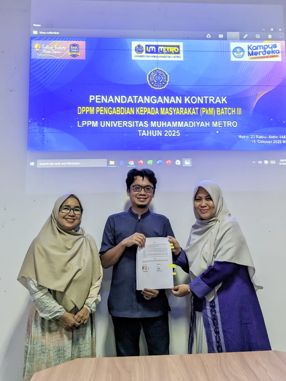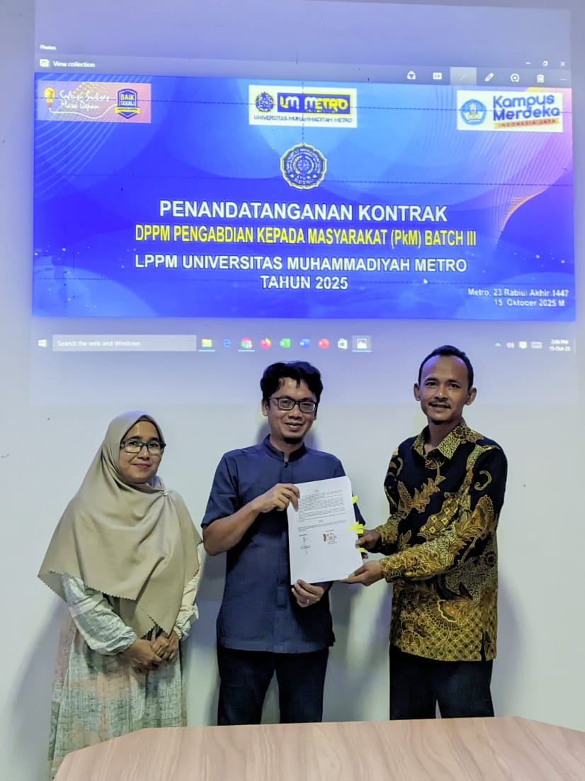 Metro, 15 Oktober 2025 - Universitas Muhammadiyah Metro (UM Metro) kembali melaksanakan penandatanganan kontrak untuk Program Pemberdayaan Masyarakat oleh Badan Eksekutif Mahasiswa (BEM) dan Pengabdian kepada Masyarakat Batch III Tahun Anggaran 2025. Acara ini diselenggarakan di LPPM UM Metro dan dihadiri oleh Ketua LPPM, Kepala PkM UM Metro serta perwakilan dari BEM UM Metro yang menjadi mitra pengabdian masyarakat.